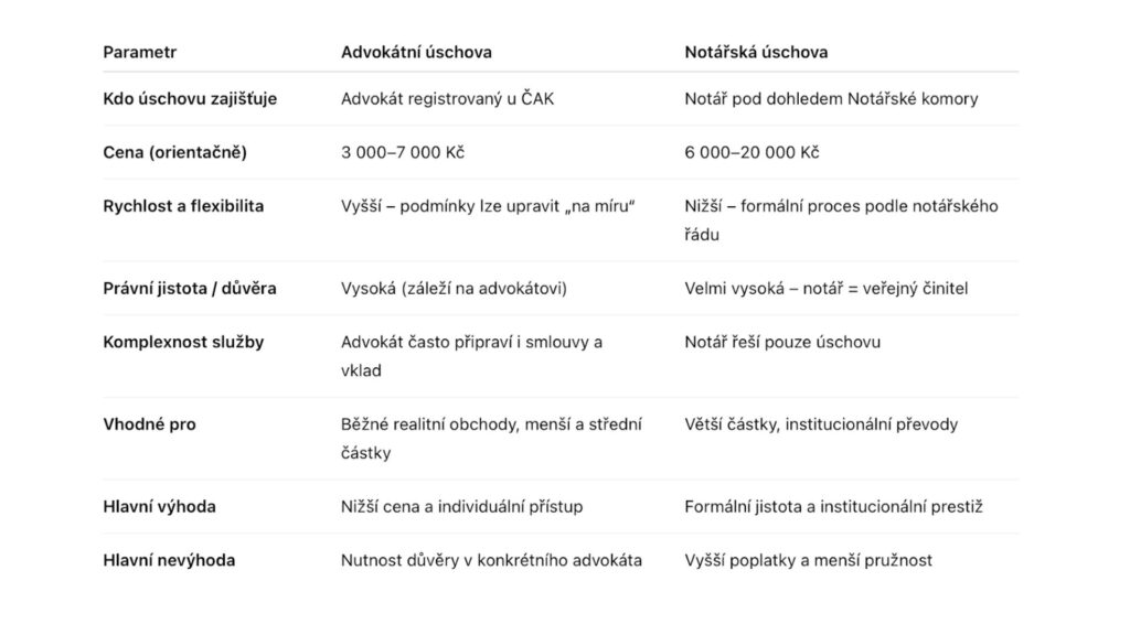 V roce 2025 jsou nejčastěji využívané dvě formy – advokátní a notářská úschova.